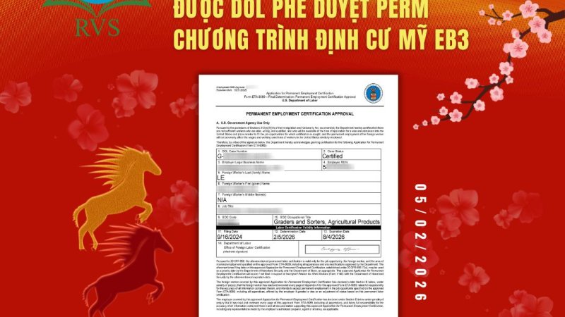 Công ty Tư vấn Định cư Toàn cầu RVS trân trọng chúc mừng Quý khách hàng L. Q. L. V. đã chính thức được Bộ Lao Động Mỹ (Department of Labor – DOL) phê duyệt PERM trong lộ trình Định cư Mỹ diện EB-3 hôm 05/02/2026. Đây là cột mốc quan trọng, khẳng định hồ … Đọc tiếp RVS CHÚC MỪNG KHÁCH HÀNG L. Q. L. V. ĐƯỢC BỘ LAO ĐỘNG (DOL) MỸ PHÊ DUYỆT PERM CỦA CHƯƠNG TRÌNH ĐỊNH CƯ MỸ EB-3