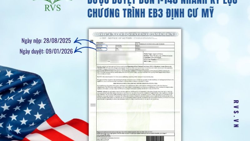 Công ty Tư vấn Định cư Toàn cầu RVS trân trọng chúc mừng khách hàng V. V. K. đã được Sở Di trú Hoa Kỳ (USCIS) phê duyệt đơn I-140 trong thời gian nhanh kỷ lục, chỉ khoảng hơn 4 tháng theo chương trình EB-3 định cư Mỹ. Ngày nộp hồ sơ: 28/08/2025 Ngày được … Đọc tiếp RVS CHÚC MỪNG KHÁCH HÀNG V. V. K. ĐƯỢC DUYỆT ĐƠN I-140 CHƯƠNG TRÌNH EB3 ĐỊNH CƯ MỸ VỚI THỜI GIAN NHANH KỶ LỤC
